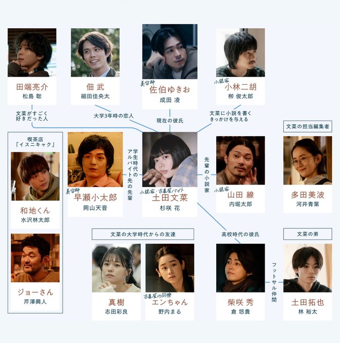 | 土田 文菜 (つちだ あやな) | 杉咲 花 | 小説家として執筆活動しつつ、古着屋でアルバイトをする27歳。 過去の恋愛経験から、人ときちんと向き合うことを避けがち。 |