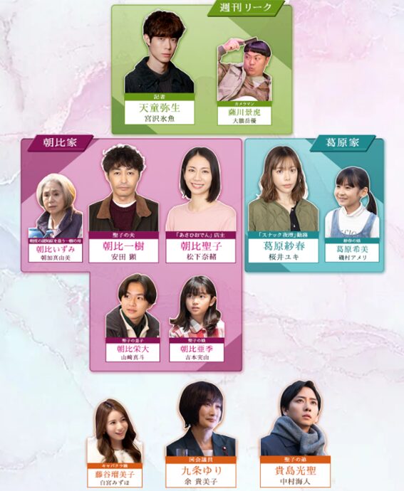 | 朝比 亜季 (あさひ あき) | 吉本 実由 | 聖子の長女で小学1年生。 父親の失踪については詳細をよく知らされていない。 |