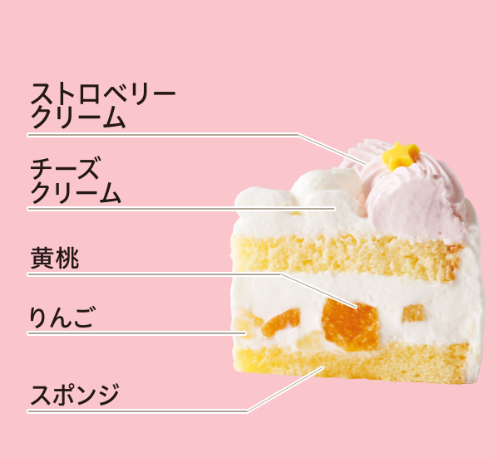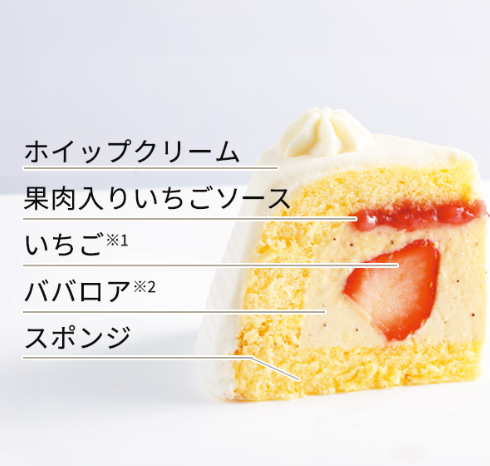 こちらのケーキは、中心部のババロアと苺を国産小麦100%で作られたスポンジが包み込み、美味しく後味スッキリなホイップでコーティング。