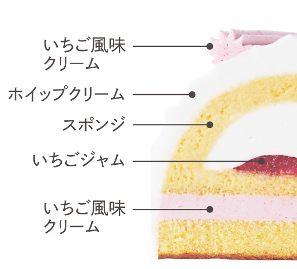 ドーム型ケーキの中には、スポンジといちご風味クリームいちごジャムが重なり、表面を生クリームでデコレーション。