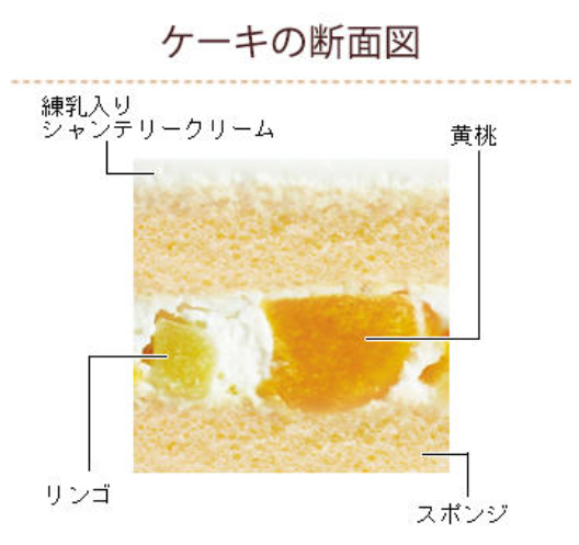 シロップ漬けのリンゴと黄桃をスポンジで挟み、練乳入りシャンテクリームでコーティングされたケーキです。
