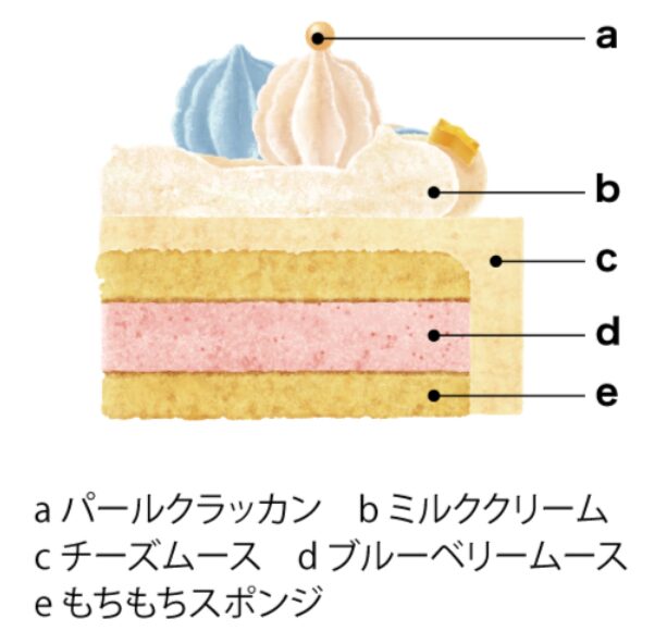 ブルーベリームースをもちもちスポンジで挟み、チーズムースでコーティングした上にミルククリームホイップをデコレーションしたケーキです。