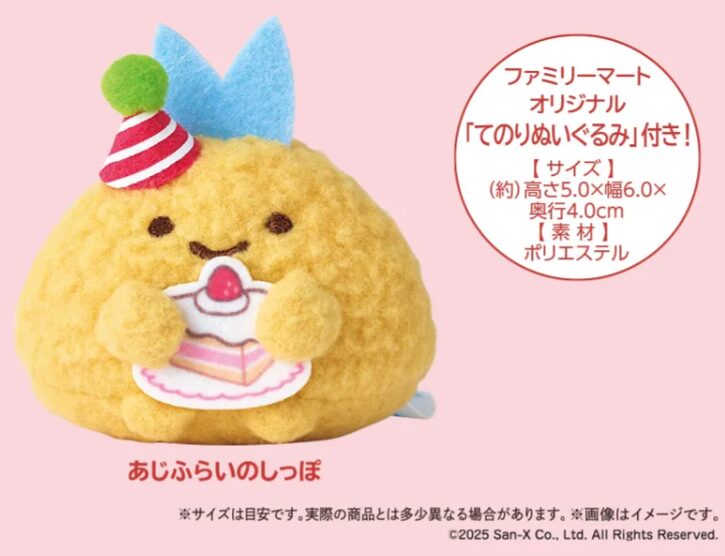 ぬいぐるみのあじふらいのしっぽがケーキを持ってて可愛いね。