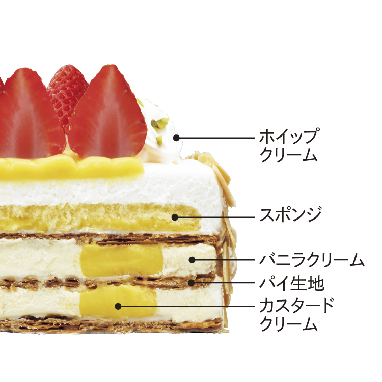 香ばしいパイ生地と、アーモンドの食感が楽しいミルフィーユケーキです。