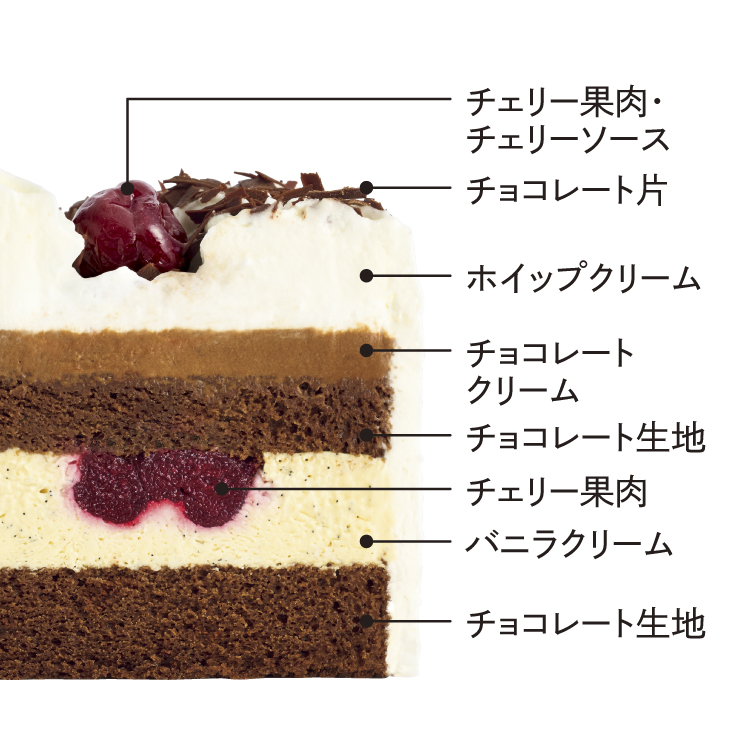 チョコレートスポンジとバニラクリーム、甘酸っぱいチェリーのハーモニーが楽しめるケーキです!